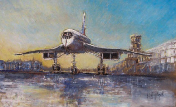 Hommage au Concorde. Huile sur carton de Concorde sur le tarmac". datée 2002. (69 x 100 cm)